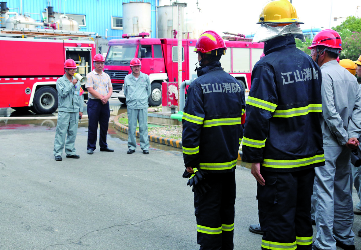 開發區環保局副局長孫同志,江山股份董事長兼總經理、黨委書記薛健參加了演練全過程。