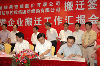 7月8日,在市經貿委主持下,我公司與耀榮玻璃、紡織染簽訂《企業搬遷合同》。市政府徐輝副市長、宗劍峰及崇川區、通州區、政府相關部門及我公司有關領導出席簽約儀式。