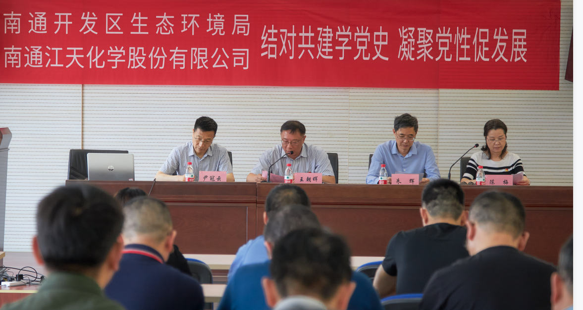 6月17日下午,南通江天化學股份有限公司與南通開發區生態環境局開展“結對共建學黨史,凝聚黨性促發展”主題黨日活動。江天公司全體黨員以及開發區生態環境局的黨員代表參加了此次活動。