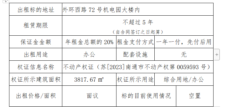 南通國泰創業投資有限公司所托管園區外環西路72號機電園,已由南通三玖企業管理服務有限公司中標負責整體招商運營管理,擬打造成“產業研發、辦公及配套商業”的總體格局,即日起公開對外招租。